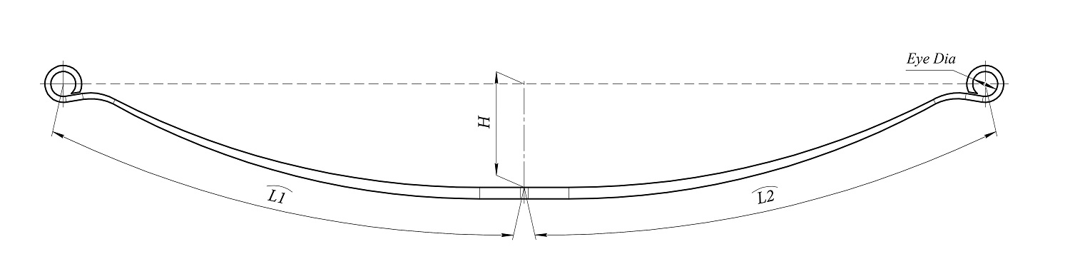 The arch height (H), also known as camber, is the vertical distance between the imaginary straight line connecting both eye centers and the highest point of the spring, typically near the center bolt.