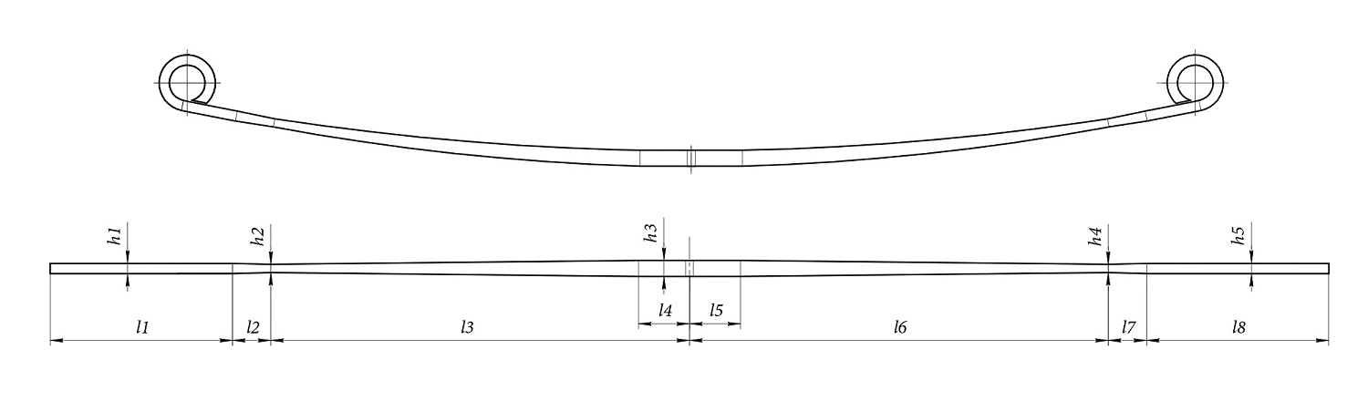 Each leaf should be measured individually. In professional applications, it is important to verify whether all leaves have uniform thickness (h) or if a progressive design is used. For parabolic leaf springs, measure the plate (the thickest part) and measure the thickness at 100 mm intervals.